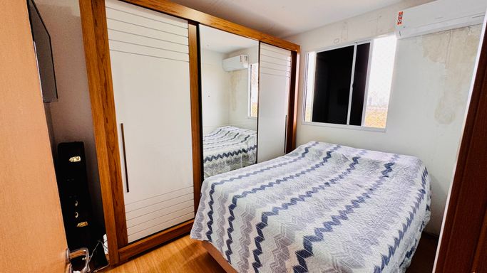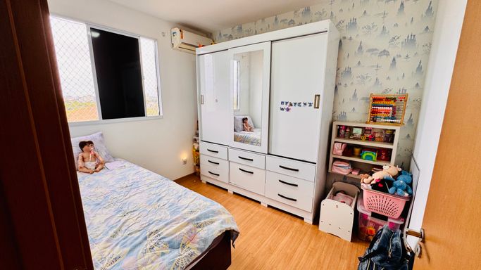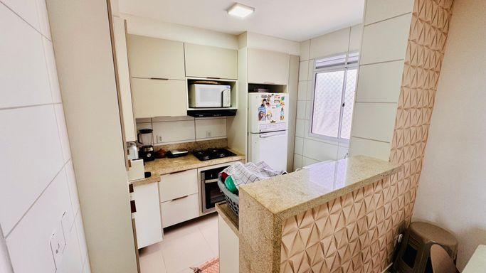 • Piso porcelanato na sala, cozinha, banheiro e varanda, e piso vinílico nos quartos